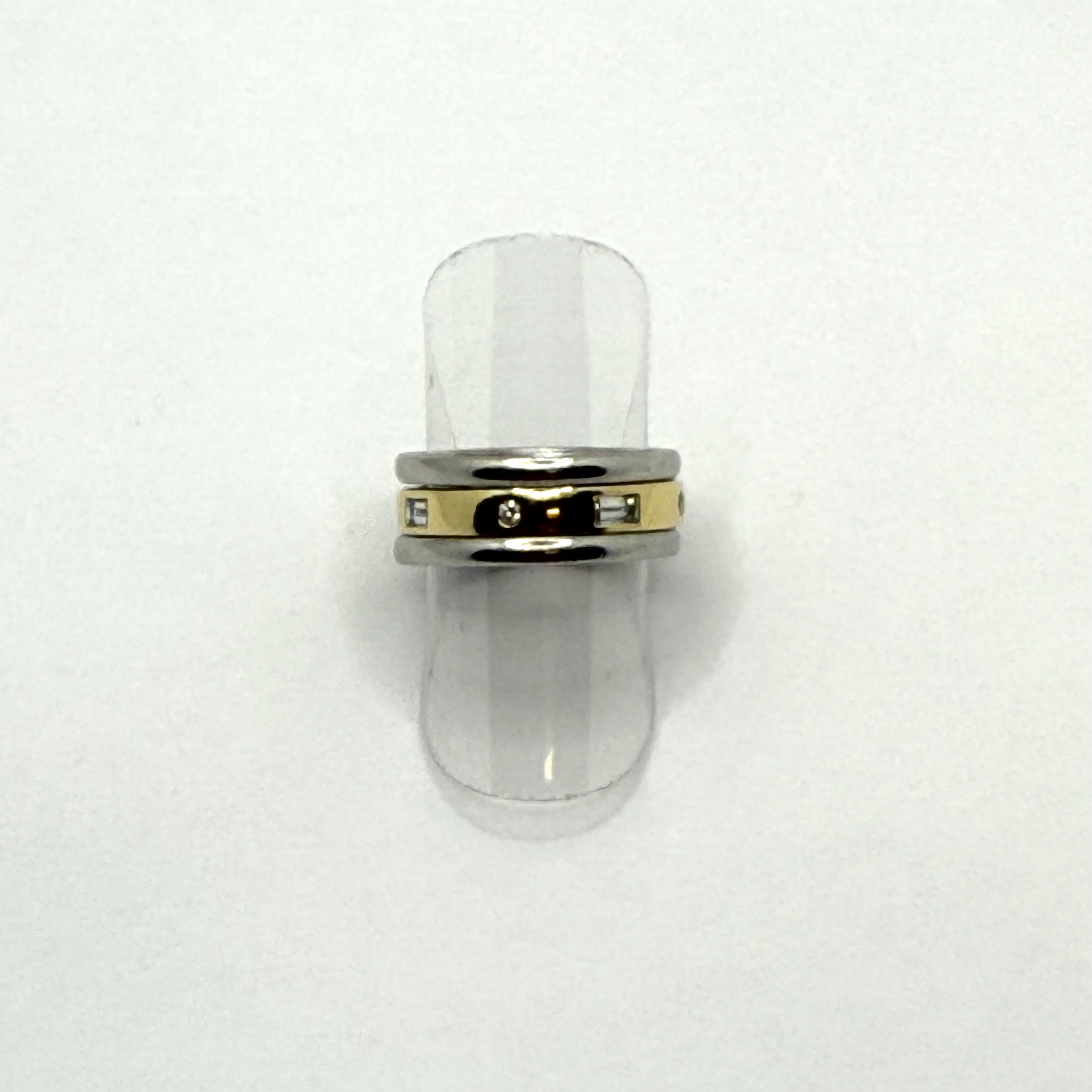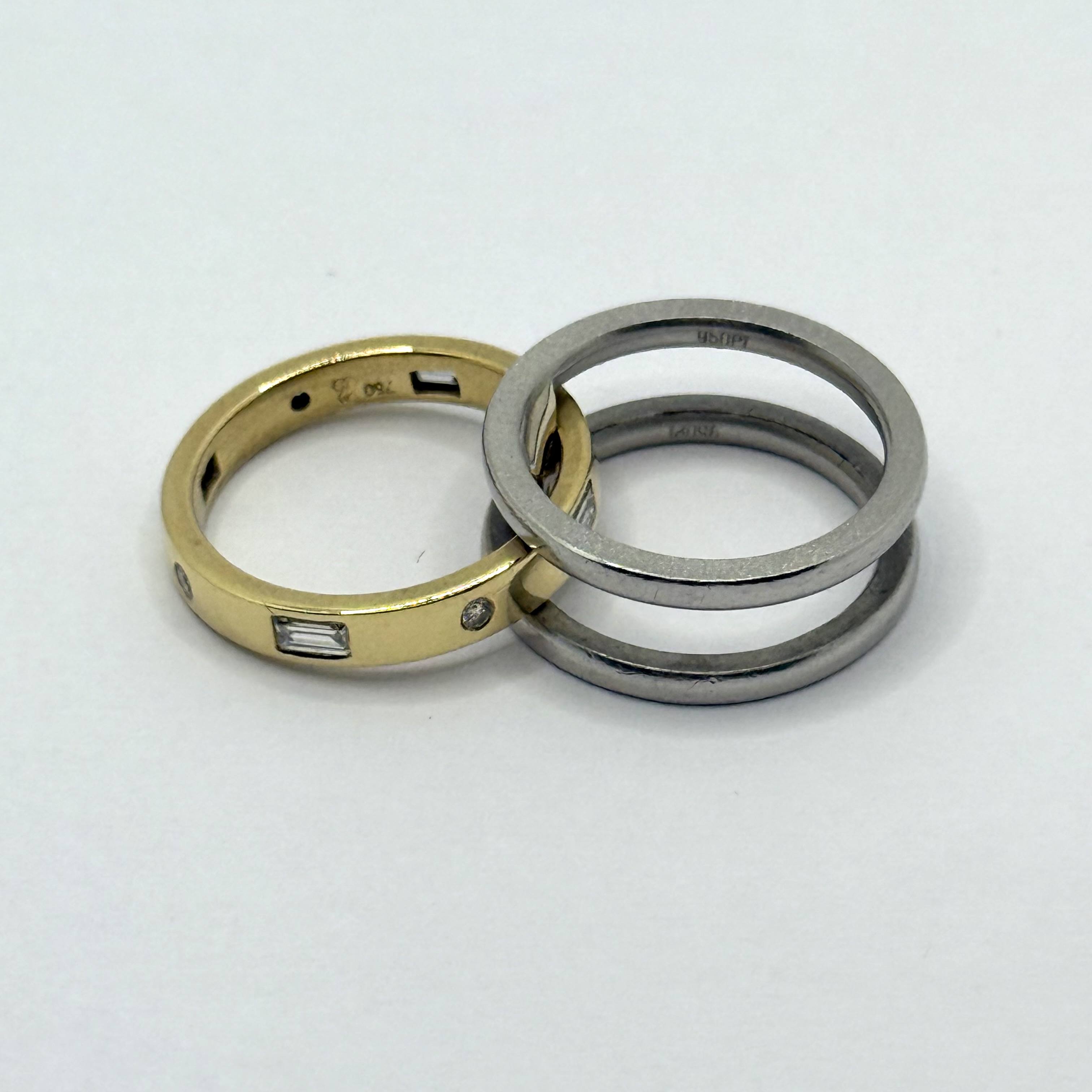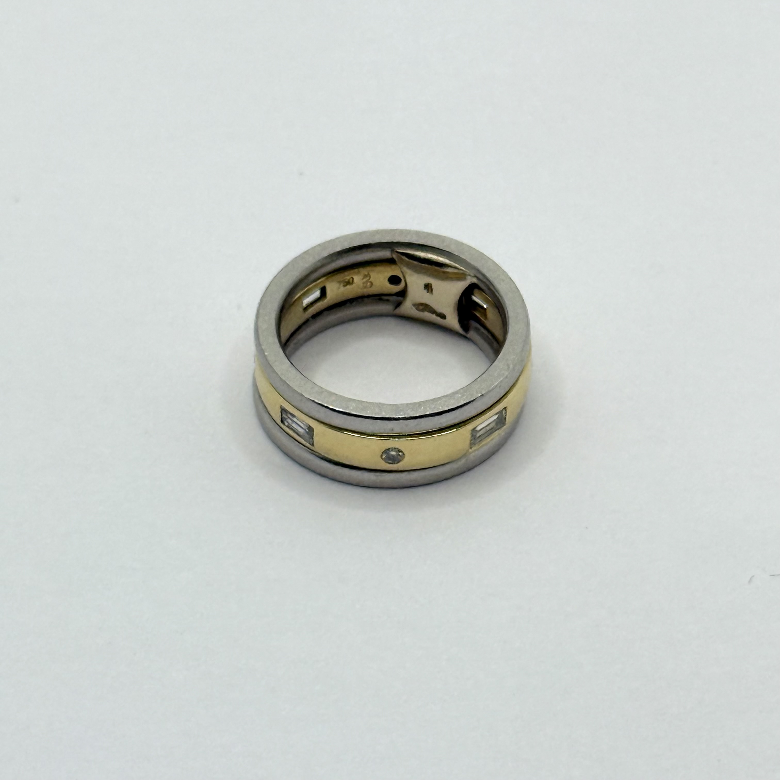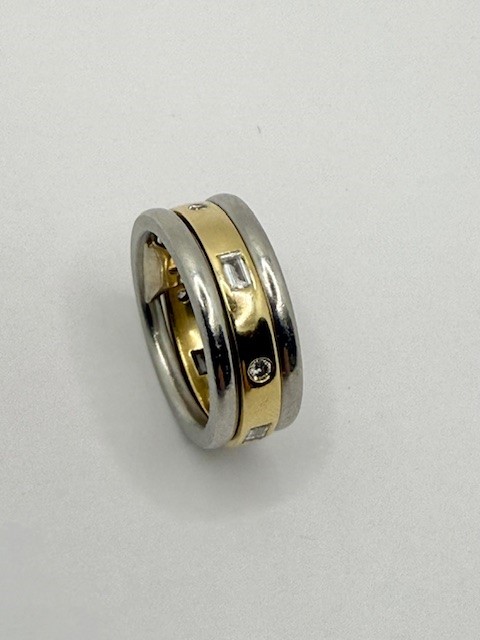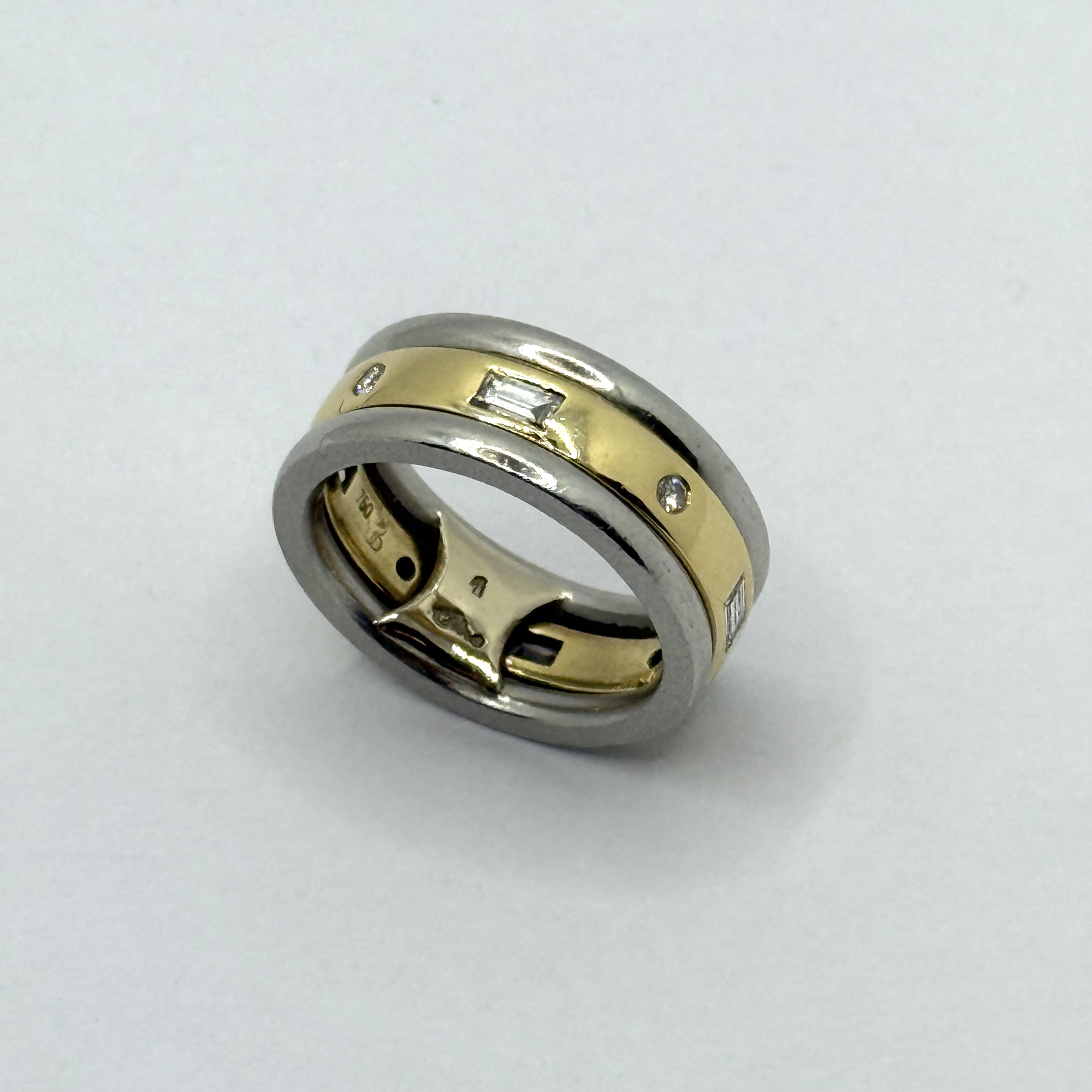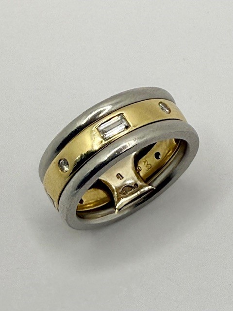 PT/750AU// 1 Bicolor Ring Gr48 mit 4 Brillanten zus ca 0,08ct und 4 Dia.-Baquettes zus ca 0,20ct 12,60 gr